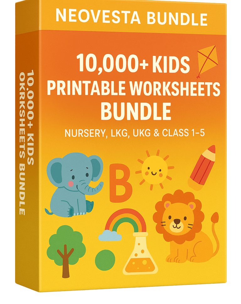 The bundle includes 10,000+ printable worksheets for LKG to Class 5 covering English, Maths, EVS, Science, Hindi, GK, handwriting, puzzles, colouring pages, and activity sheets. It’s a complete learning package for daily practice.